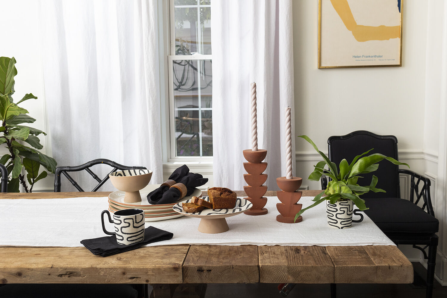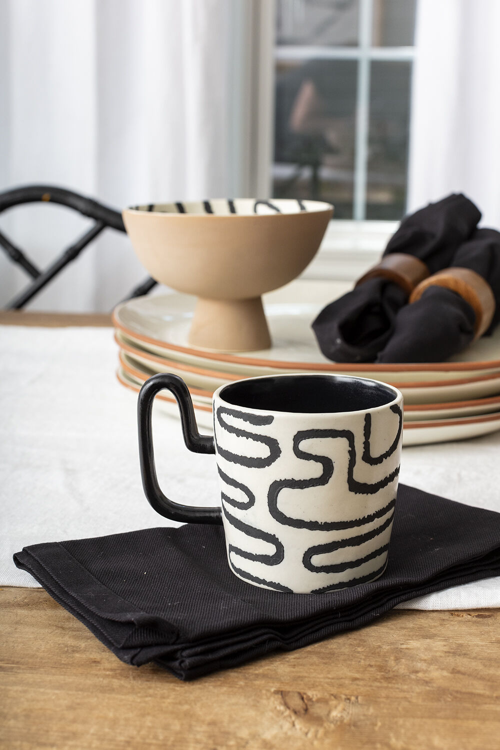 Introducing the Calypso Collection, a modern addition to your tableware. With its simple yet elegant bisque finish on the bottom and hand-painted black and white squiggle design on top, the footed Calypso Tray is a must-have for any sophisticated and exclusive dining setting. Elevate your dining experience today.