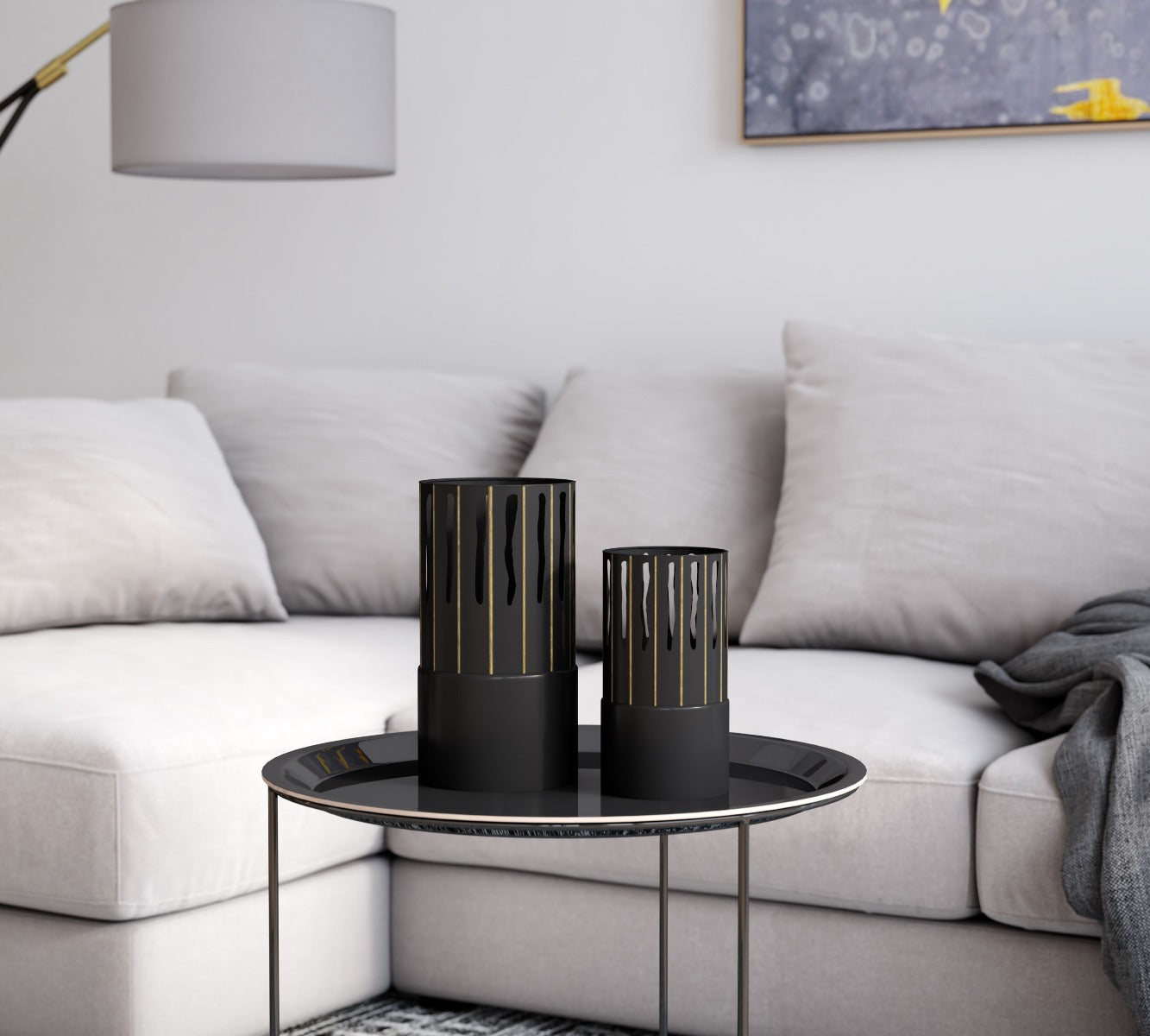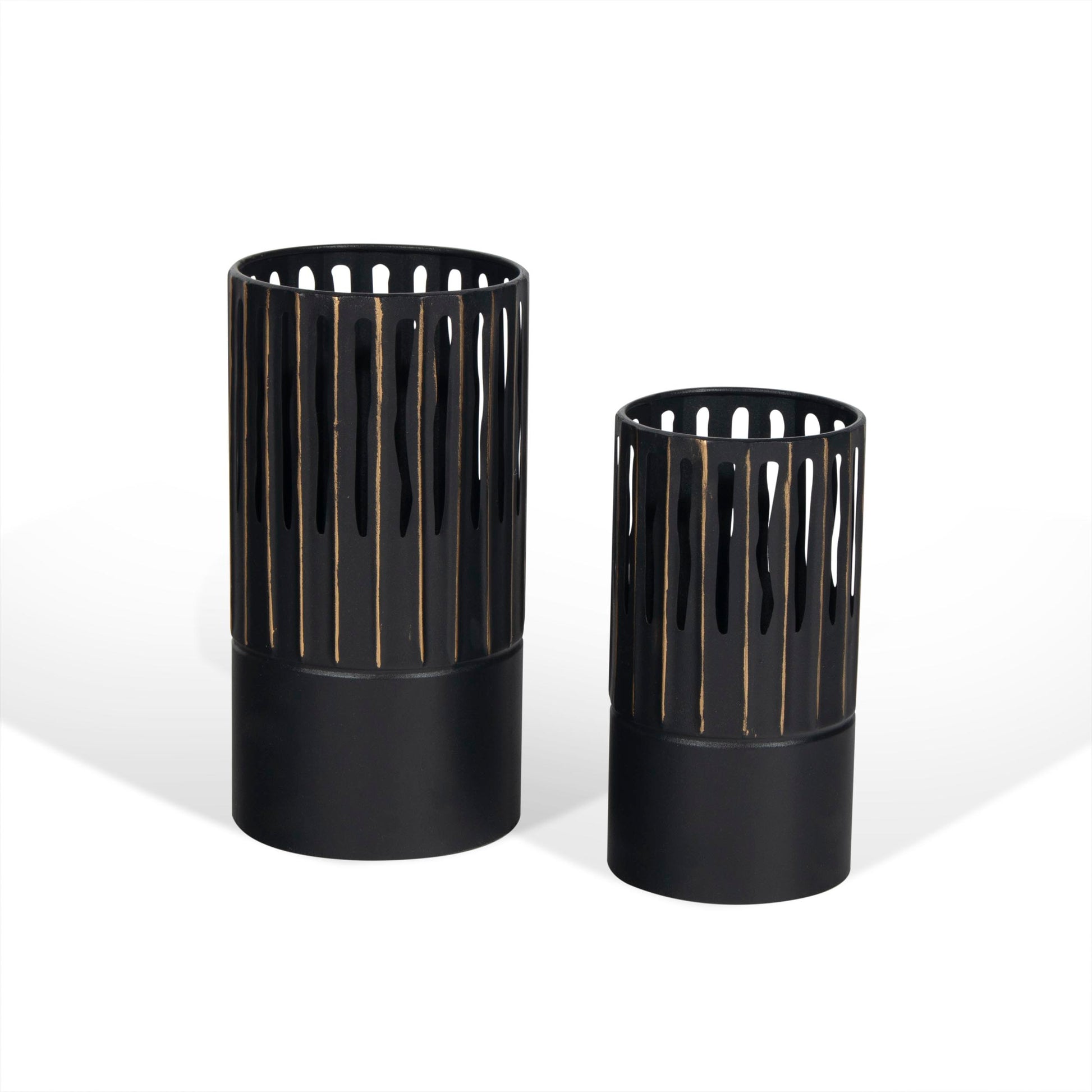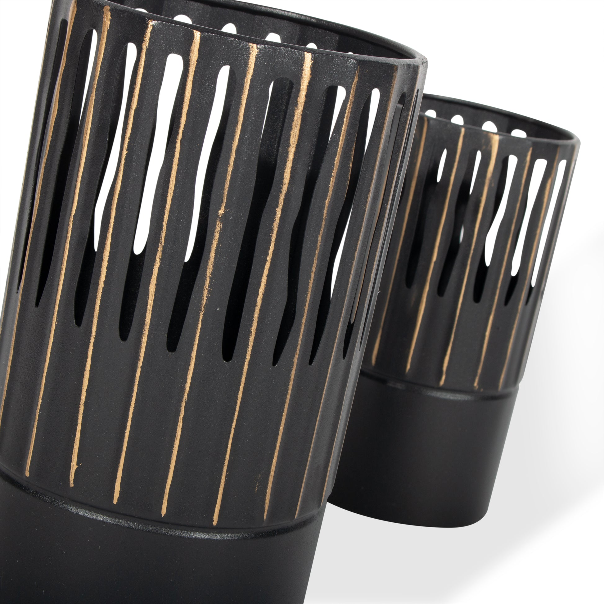Crafted from metal, these black and gold vases fit the contemporary modern theme perfectly. With a unique cut outs and texture throughout, these vases look great with or without flowers in them and add a impressive statement to your décor.