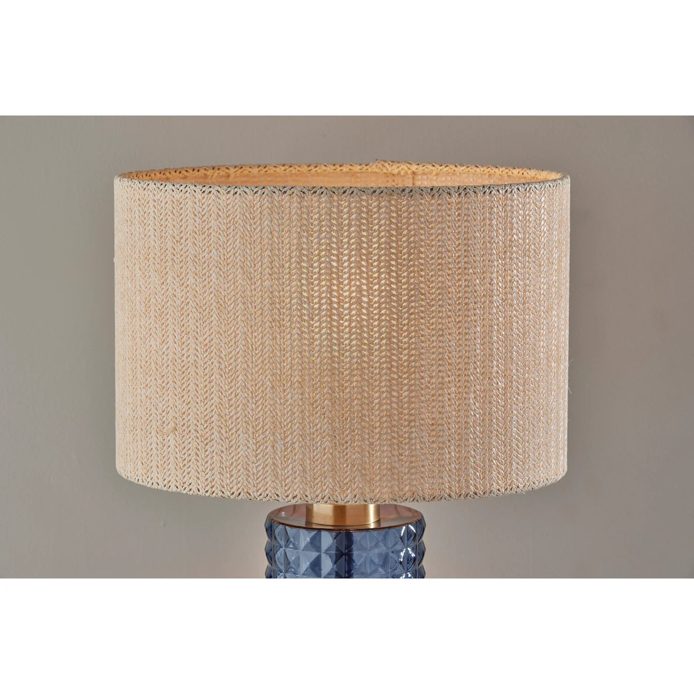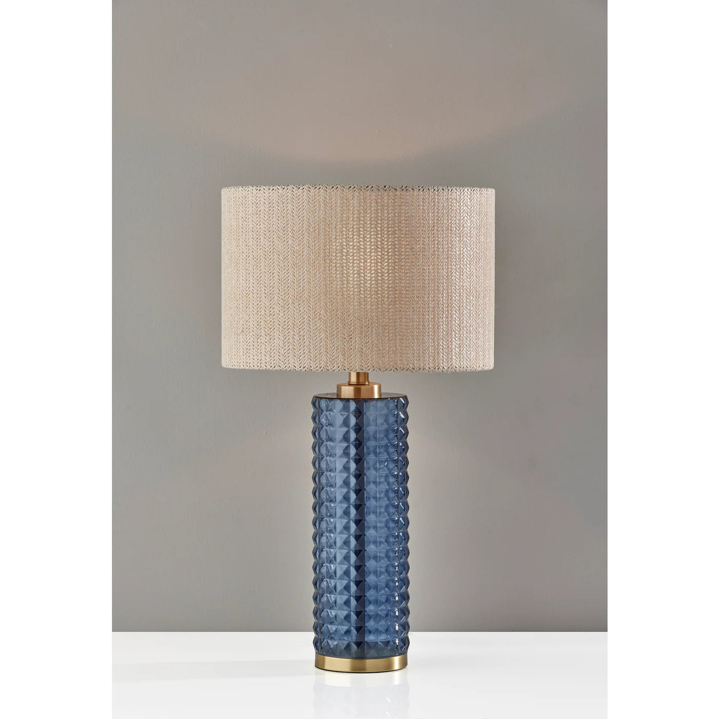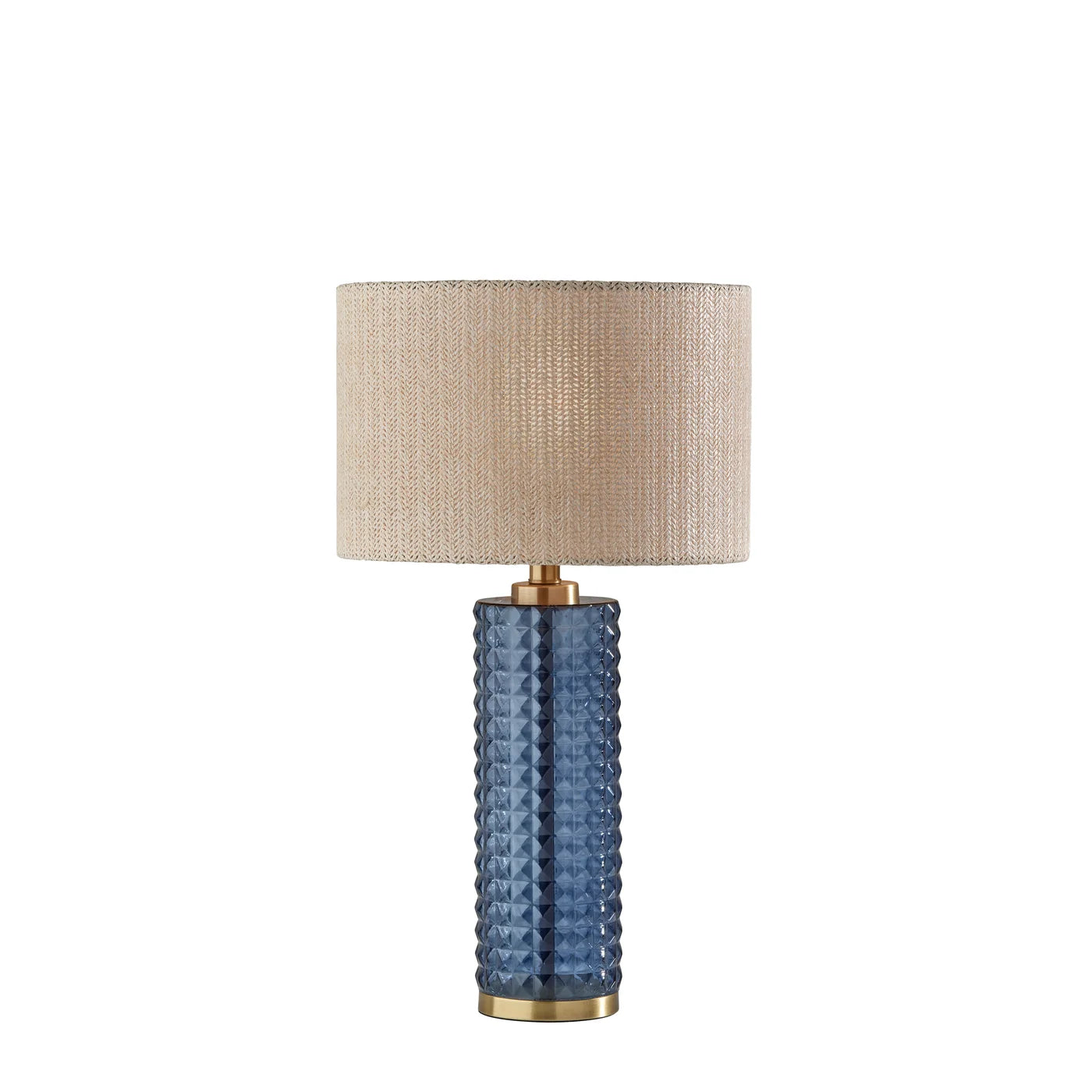 Delphi is the first of our Coastal Collection, inspired by European coastal towns. This table lamp brings a warm, coastal touch to your bedside space or living area. The Delphi features a tall cylindrical body made of blue textured glass supported by an antique brass metal frame. It is topped by a drum shade made of woven light beige fabric for a natural look.