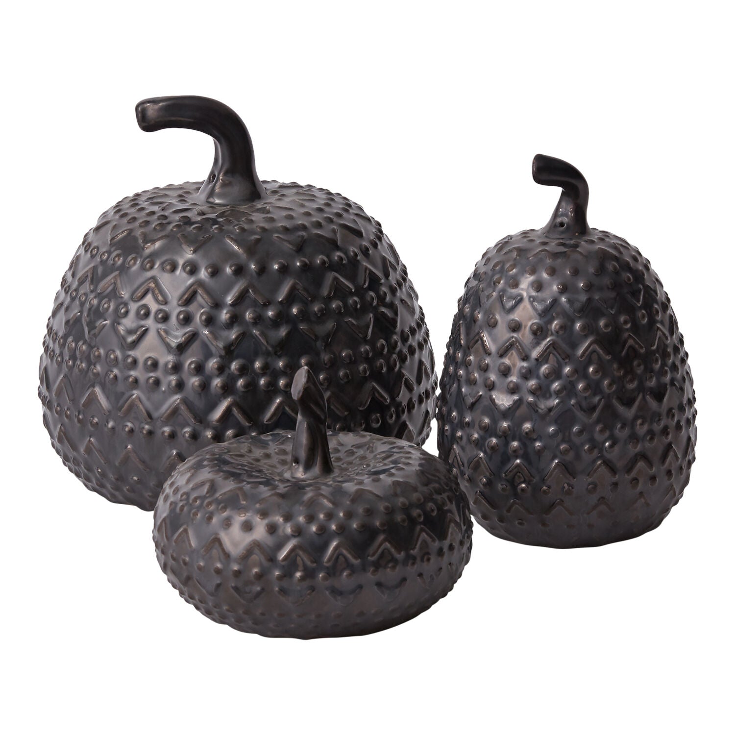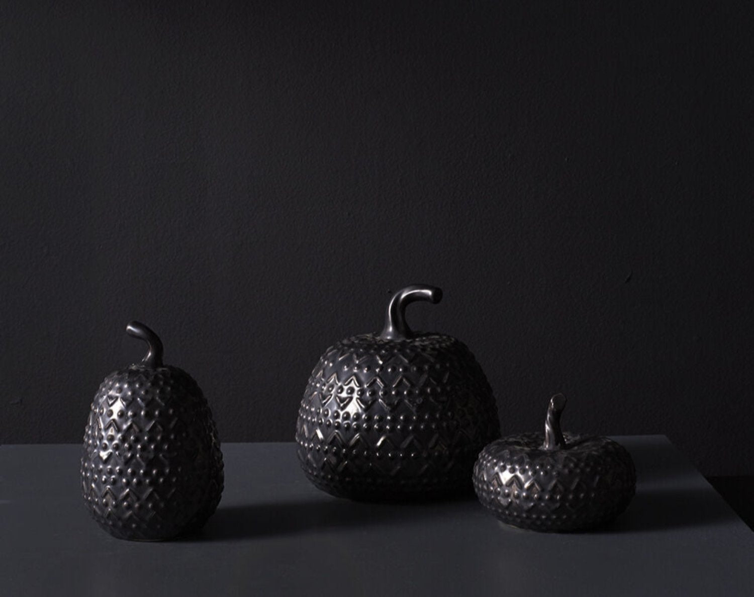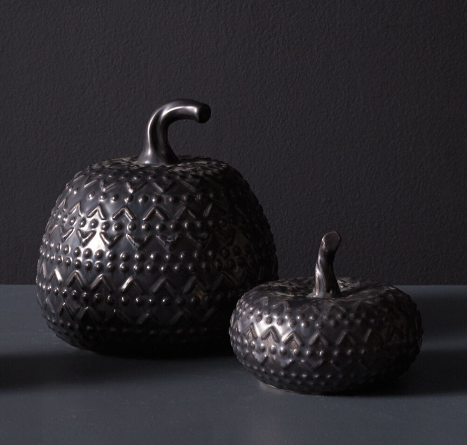 Each pumpkin features an embossed pattern that adds depth and character to its dark grey surface, reflecting the light in subtly intriguing ways.