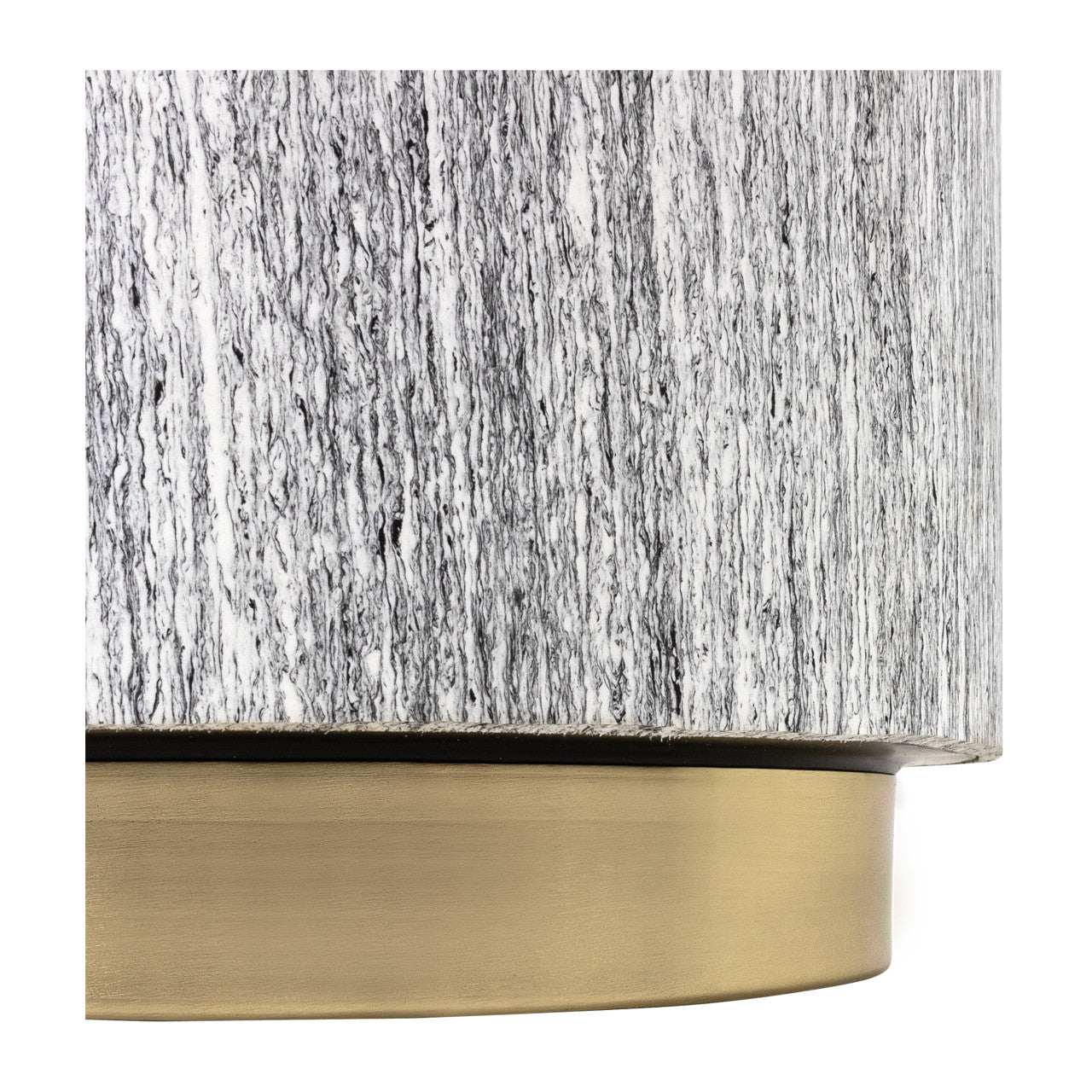 The Khamisi table features a cylindrical body supported by a gold base. Whether placed in the living room or bedroom, this neutral tone piece is sure to lend an air of luxury and warmth to any setting.