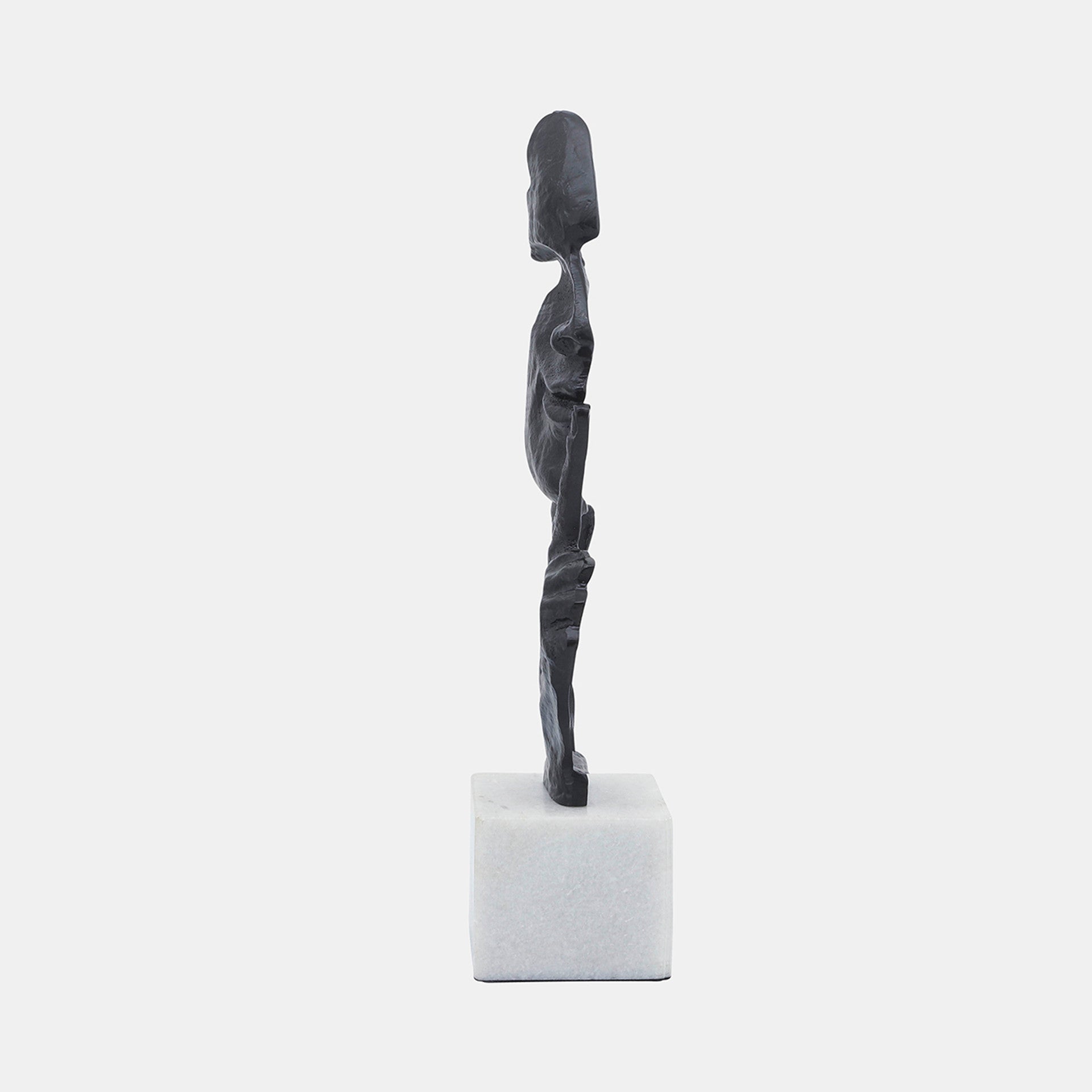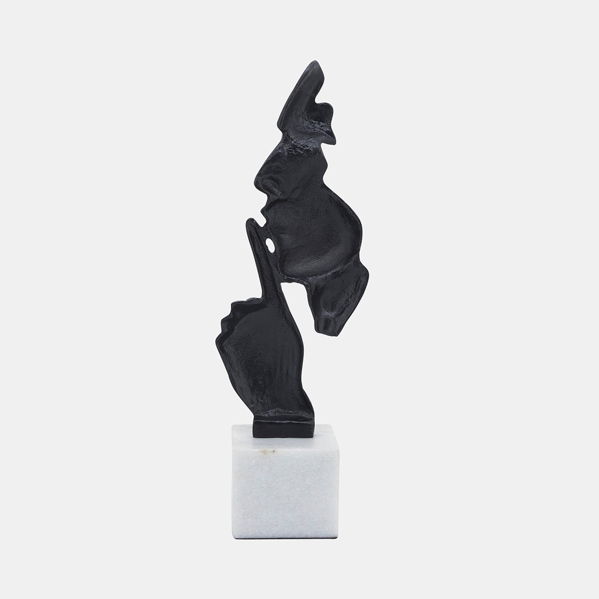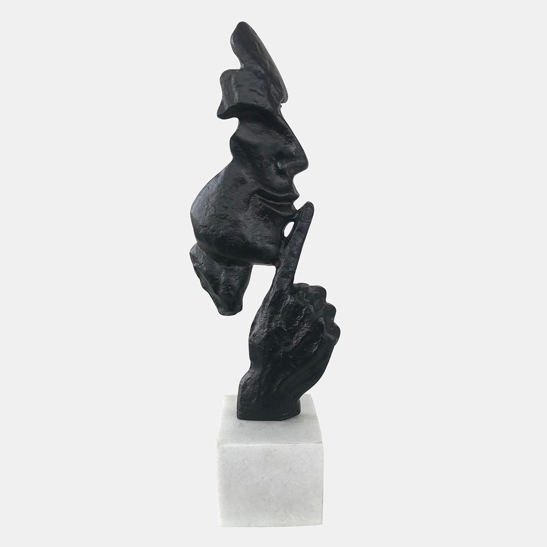 Discover a uniquely articulated metal sculpture, fashionably titled 'Silence Please'. Crafted from top-grade metal and finished in an elegant black color, this 16" piece adds a dash of sophistication and artistic flare to any setting. The sculpture is firmly poised on a sturdy marble base, promising a great balance and longevity for the piece.