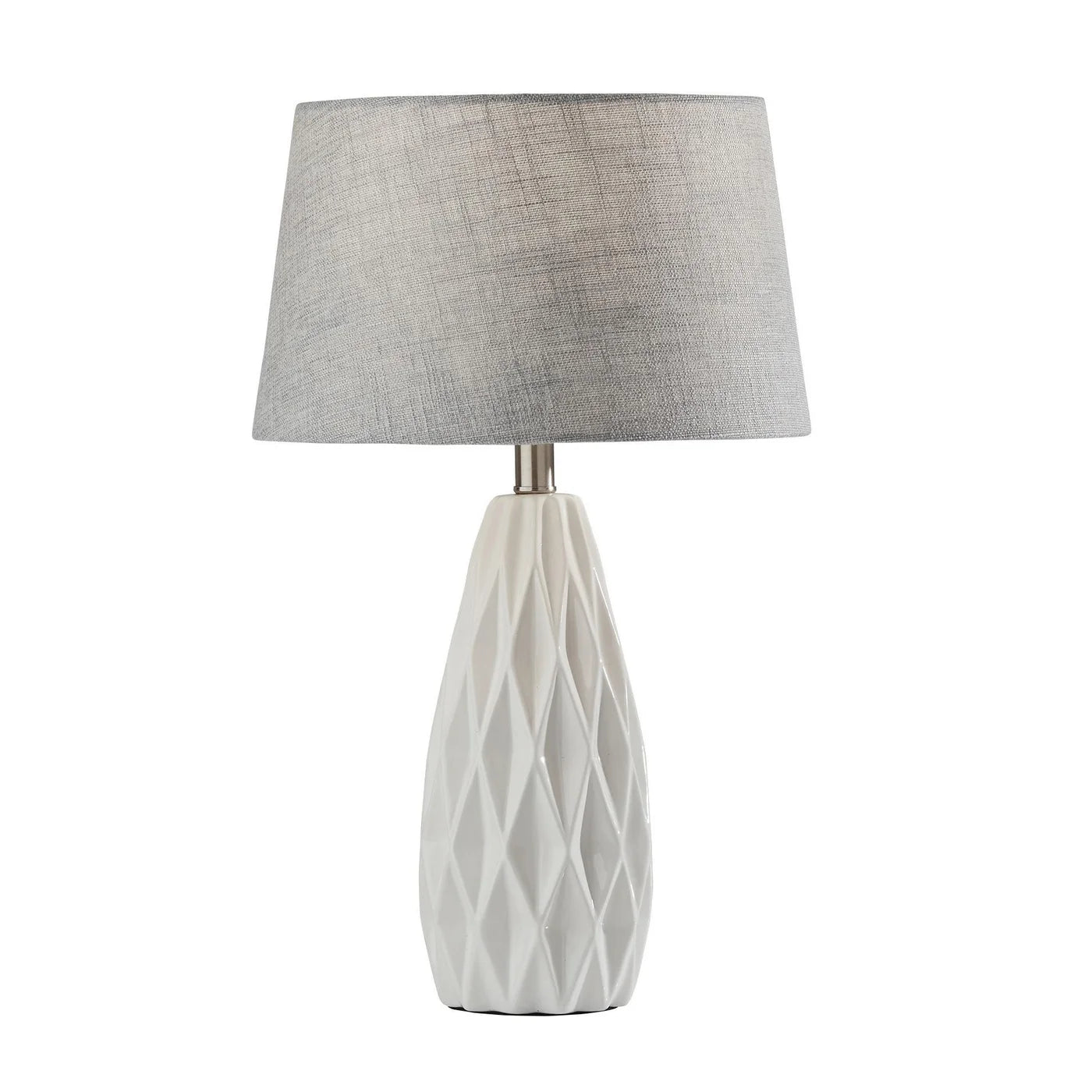 Make a statement in your home or office with this eye-catching Zuberi Lamp. The white Zuberi Table Lamp has a ceramic base and a unique geometric silhouette while the grey fabric shade reveals its beautiful texture when lit up. Turn the lamps on and off with a convenient switch on the socket.